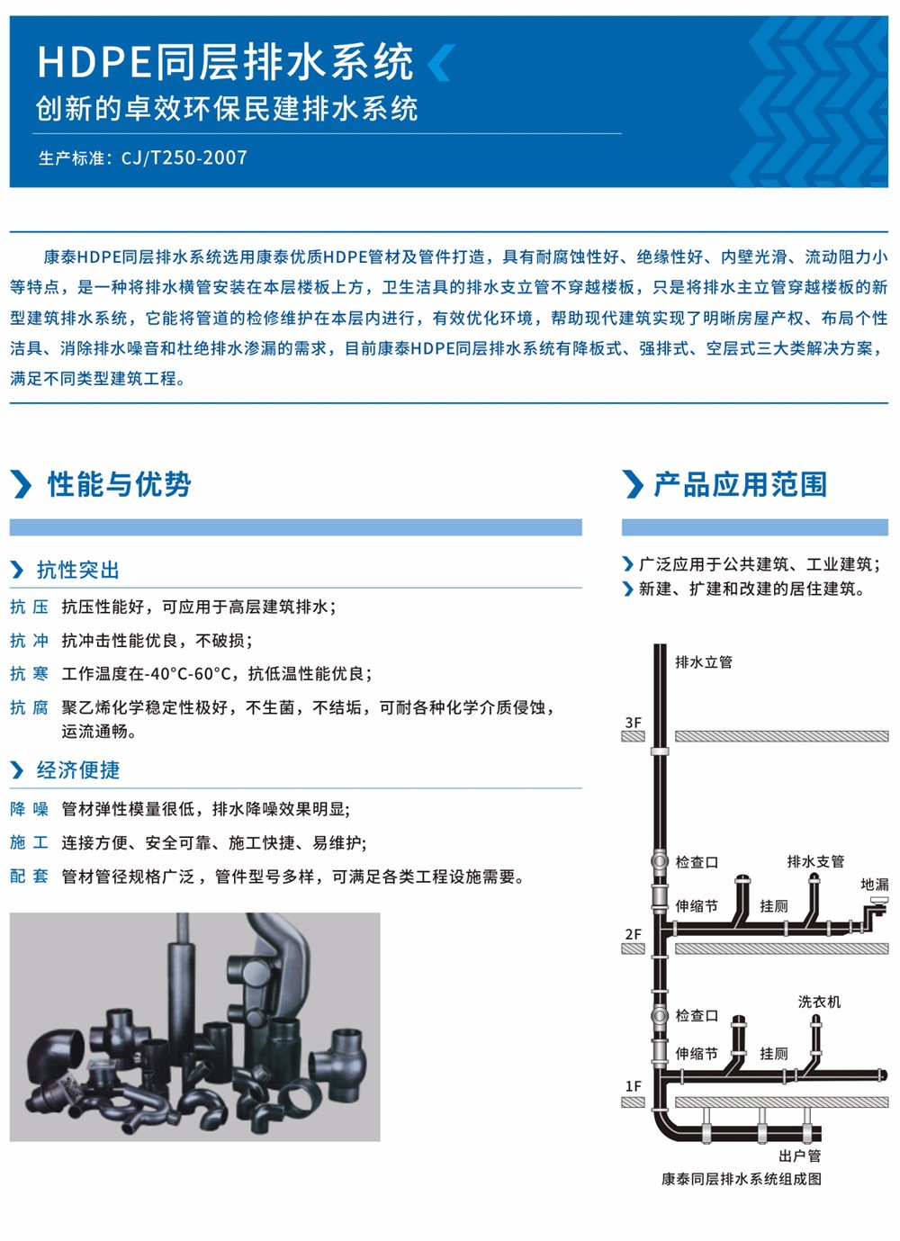 集團研發(fā)的HDPE同城排水系列產(chǎn)品,選用選優(yōu)質(zhì)管材及管件打造,具有密度小、重量輕、韌性好、綠色環(huán)保、耐腐蝕、耐老化、絕緣性好、內(nèi)壁光滑、流動阻力小、安裝快捷方便等特點。根據(jù)目前各類用戶的不同條件的需求,康泰HDPE同層排水系統(tǒng)有三種安裝方案,分別是降板式、墻排式、墊層式,既降低了土建成本,增加了整體凈空高度;又達到了衛(wèi)生、美觀、整潔的要求。